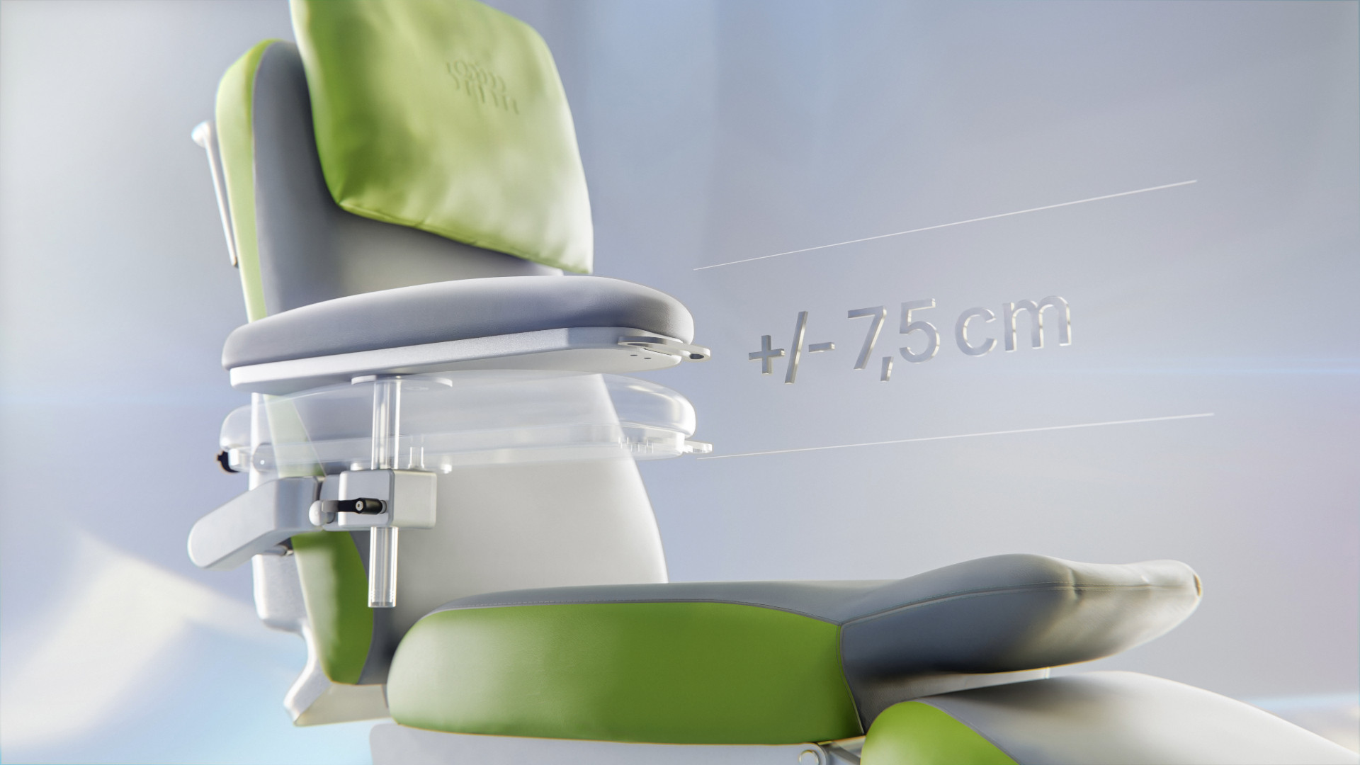 The three-part chair surface can be effortlessly and precisely adjusted electrically – fully tailored to the needs of each treatment situation. Whether in a sitting or lying position, the patient can be positioned quickly and ergonomically. This not only relieves the staff’s back but also saves valuable time in daily clinical work.
